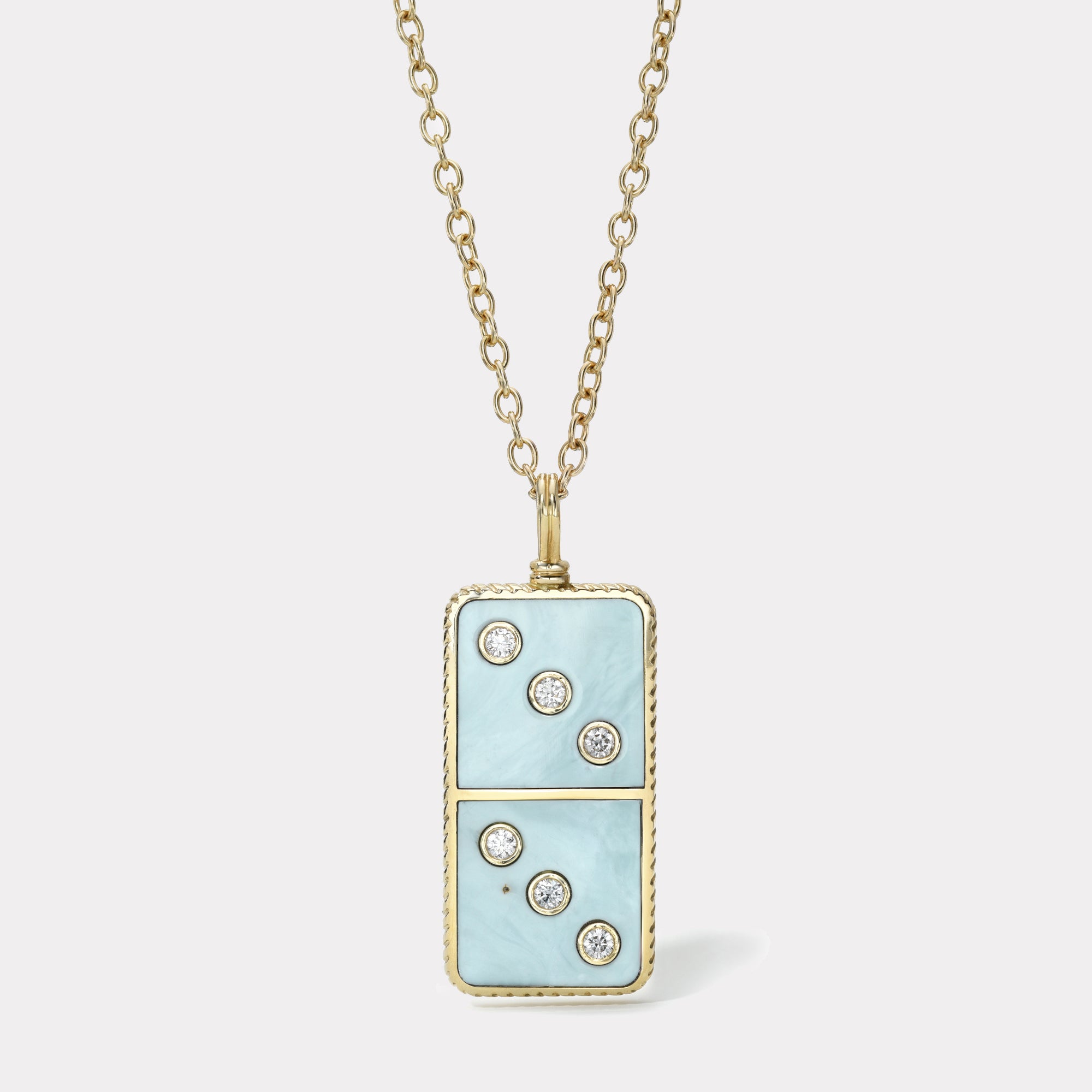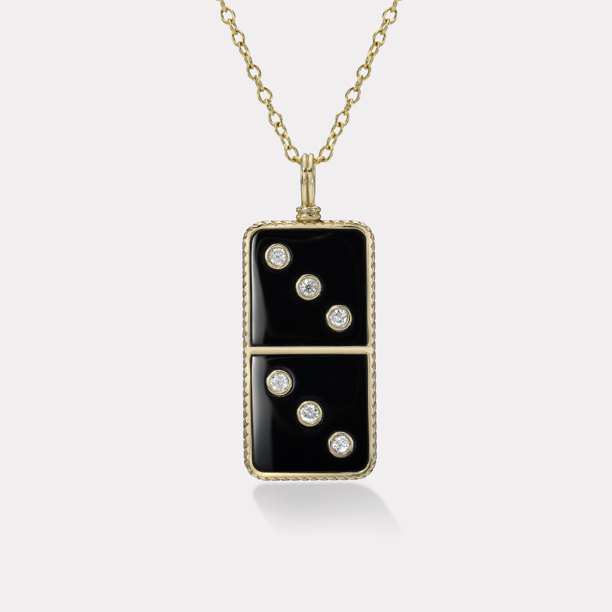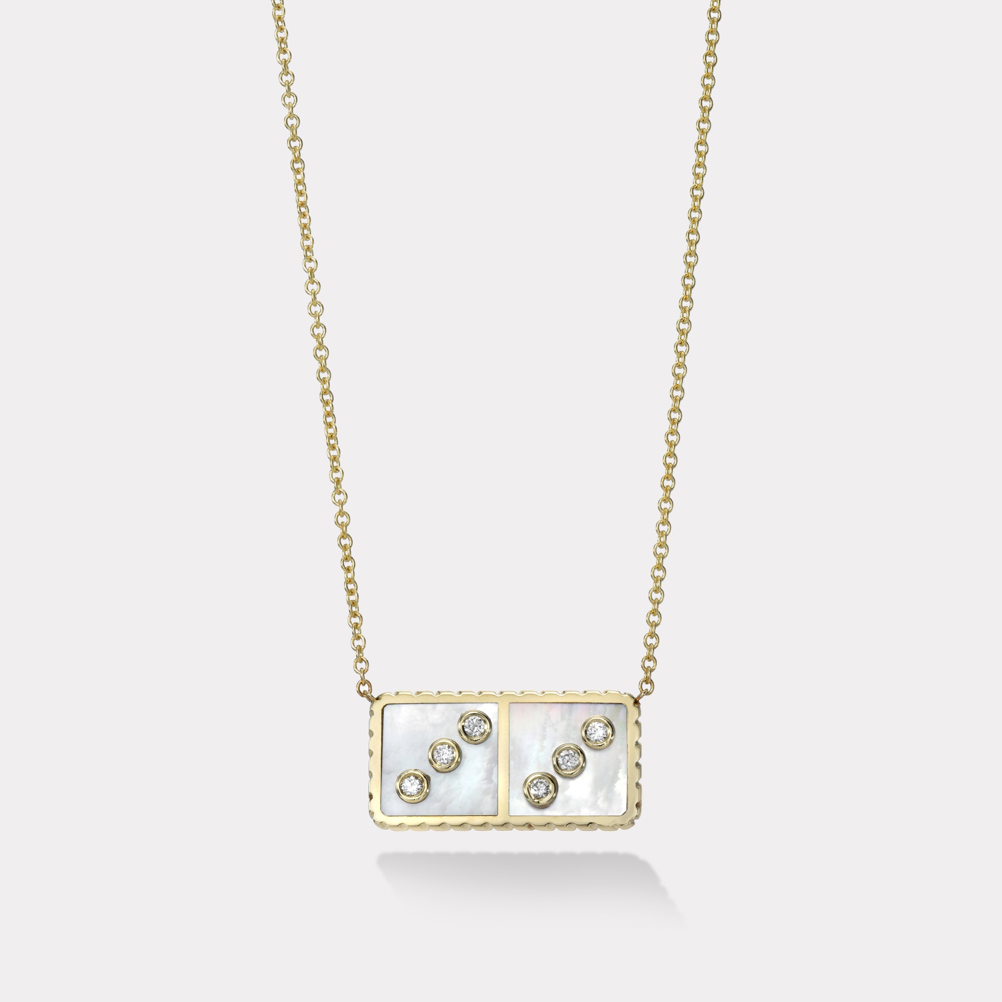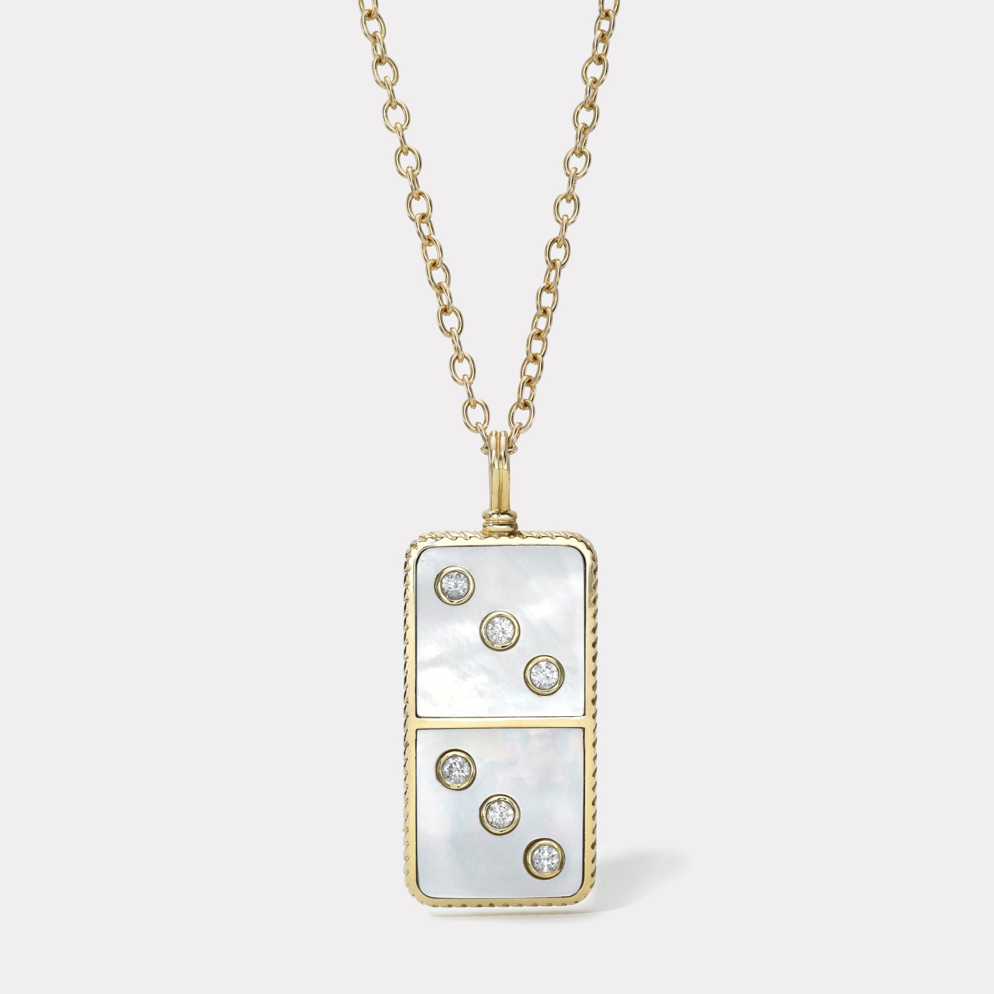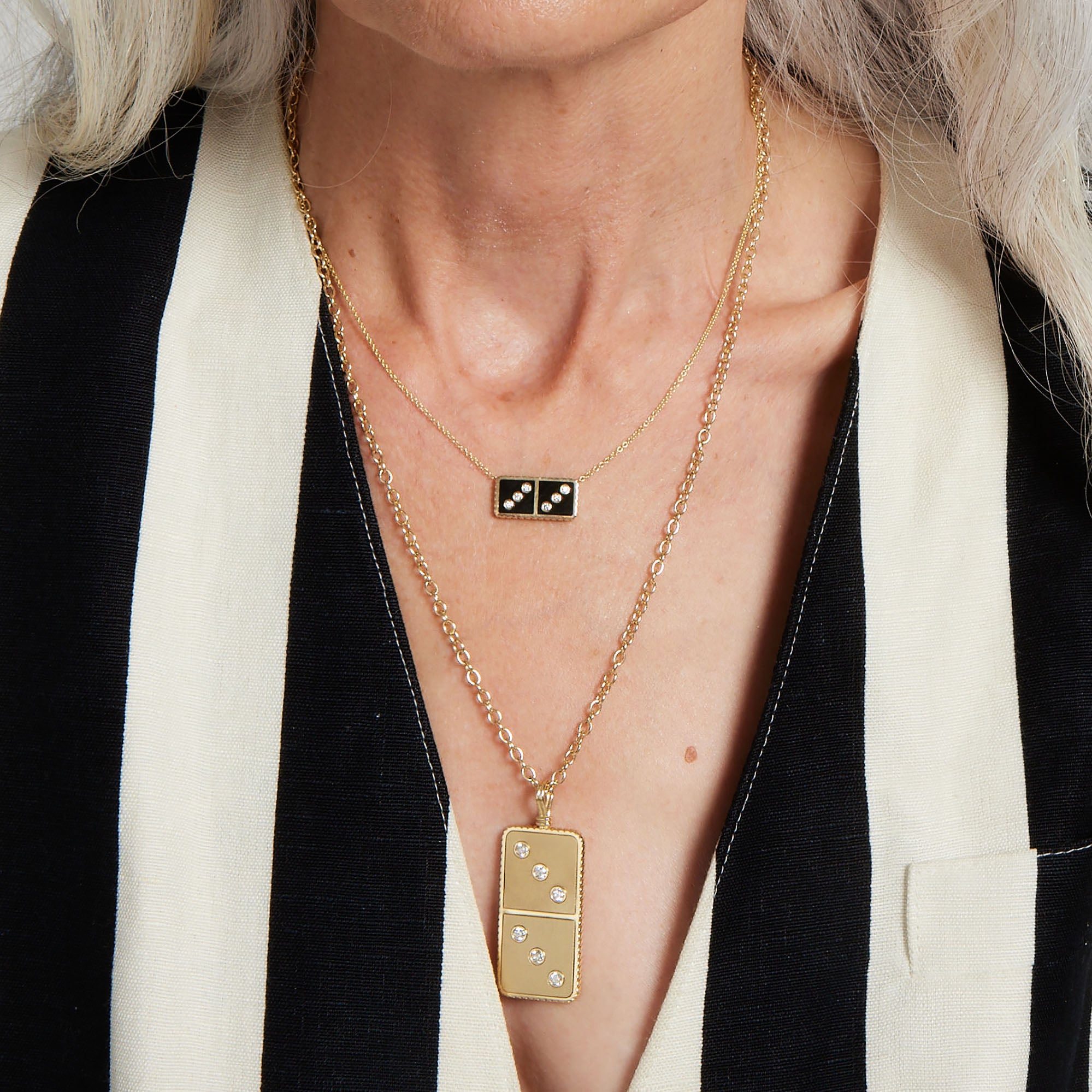Our Domino collection represents the idea that even small actions can create a large impact. Every action we take has a ripple effect on the world around us. One small act of kindness or cruelty can set off a chain reaction. The back of the domino pendant is engraved with "Everything starts somewhere."