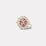 Ring crafted in 18k yellow gold with a stunning 3.4ct Oval Pink Tourmaline center with 2.16ct white round brilliant Diamond halo.
