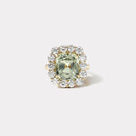 Ring crafted in 18k yellow gold with a 8.46ct Green Sapphire center and 2.16ct white Diamond halo.