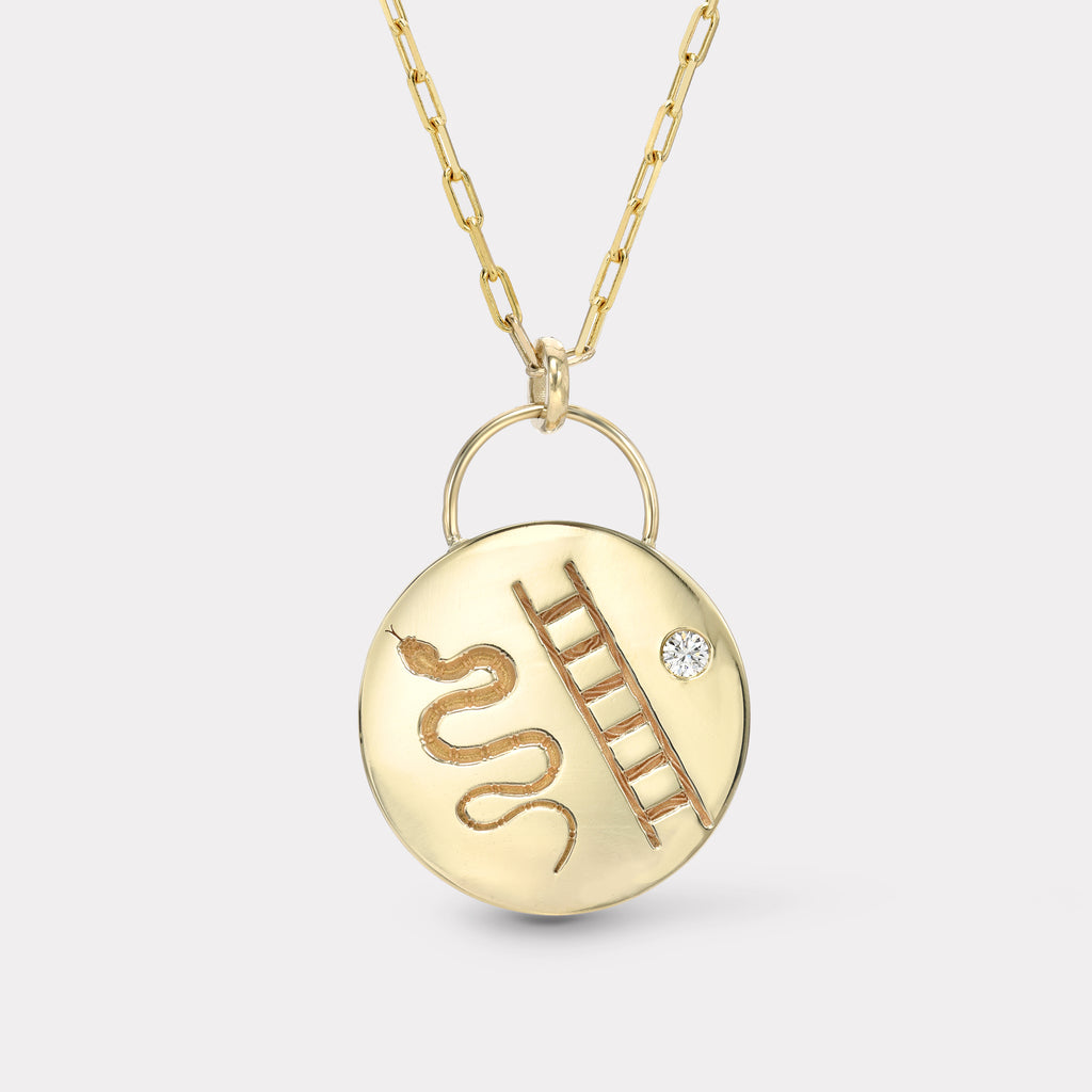 The snake and ladder represent vitality. Two steps forward, one step back. This pendant is a play on the childhood game snakes and ladders. This pendant serves as a reminder to be resilient, and always look forward.