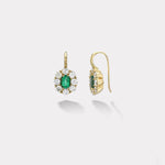These 1.52ct Emerald Ovals are surrounded by a halo of brilliant white diamonds totaling 2.89cts. These hook earrings are solid 18k yellow gold and sit close to the ear.