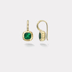 These Cushion Cur Emeralds are set in our signature Heirloom Bezels. These earrings are solid 14k yellow gold and sit close to the ear. Total carat weight is 1.70cts