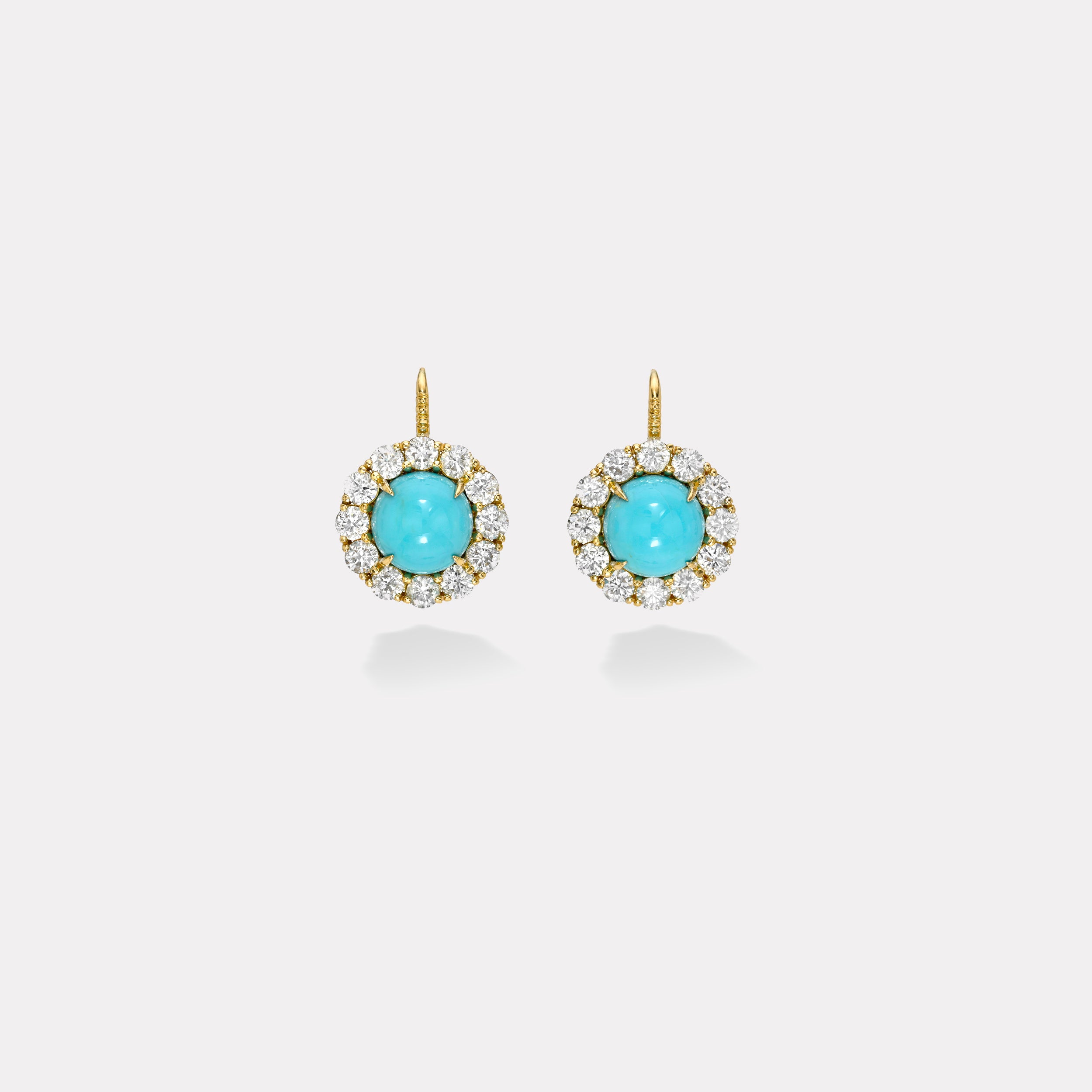 These 10.6ct Round Turquoise Cabochons are set in our signature Heirloom Bezels with a 4.65ct Diamond halo. These earrings are 18k yellow gold and sit snug below the ear lobe.