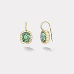 These 12ct Cushion Green Tourmalines are set in our signature Heirloom Bezels. These hook earrings are solid 14k yellow gold and sit close to the ear.