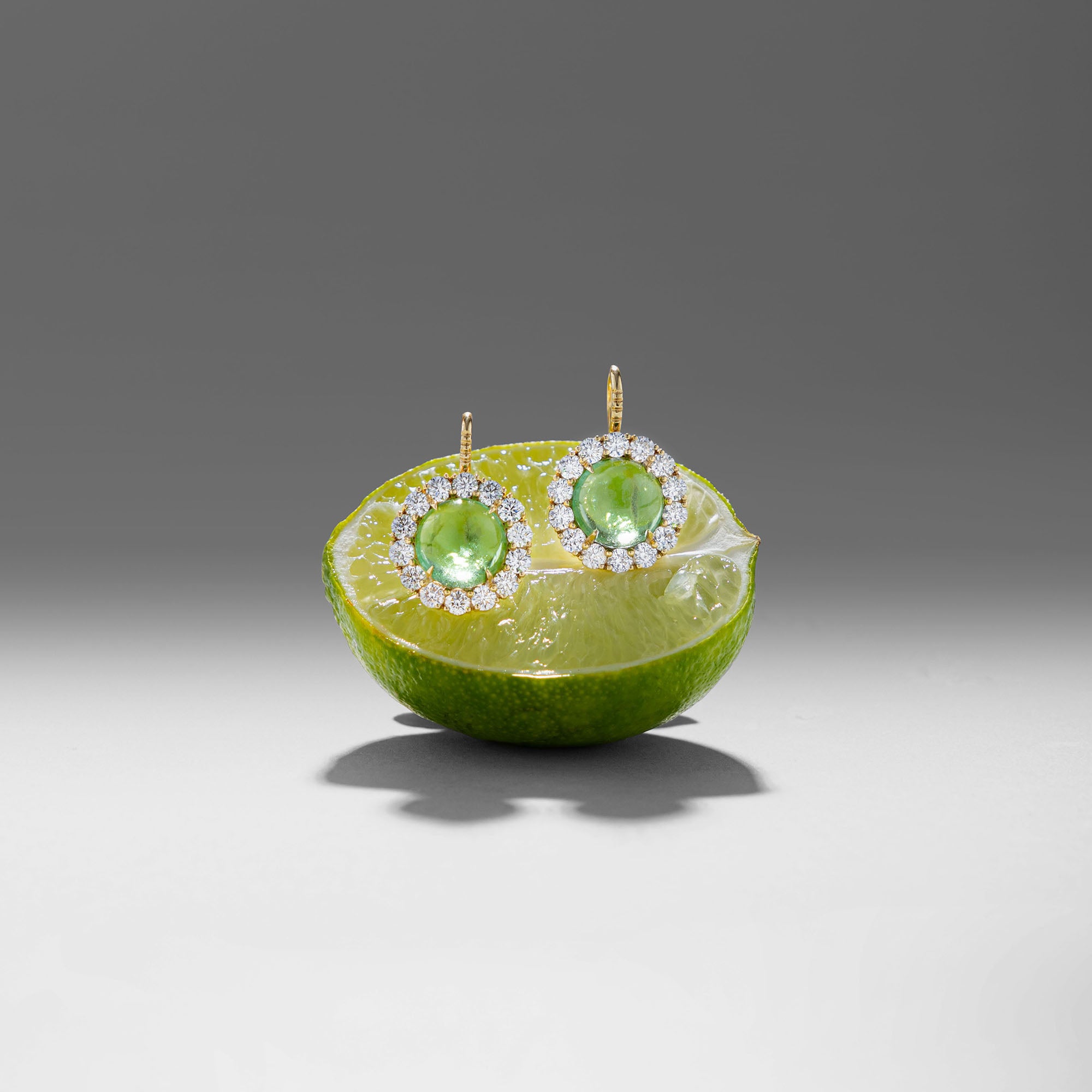 These 17.09ct Cabochon Green Tourmalines are surrounded by 4.31ct Diamond Halo and are set in our favorite 18k yellow gold heirloom bezel setting. These earrings sit close to the ear.