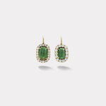 These mismatched 17.57ct Cabochon Green Tourmalines are surrounded by 3.85ct Diamond Halo and are set in our favorite 18k yellow gold heirloom bezel setting. These earrings sit close to the ear.