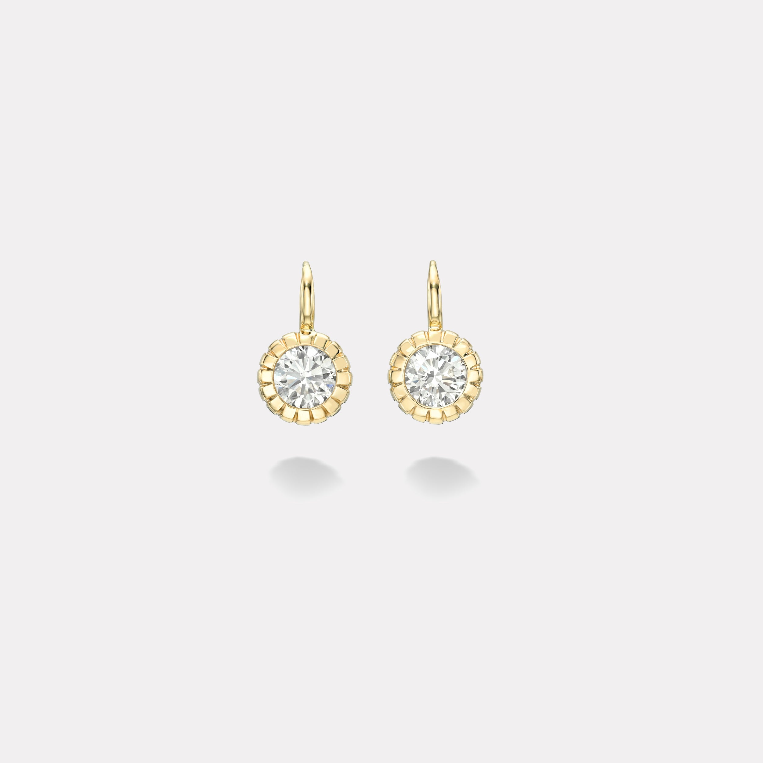 These gorgeous GIA Round Diamonds are set in our signature Heirloom Bezels. These earrings are solid 14k yellow gold and sit close to the ear. Total carat weight is 2.06cts.