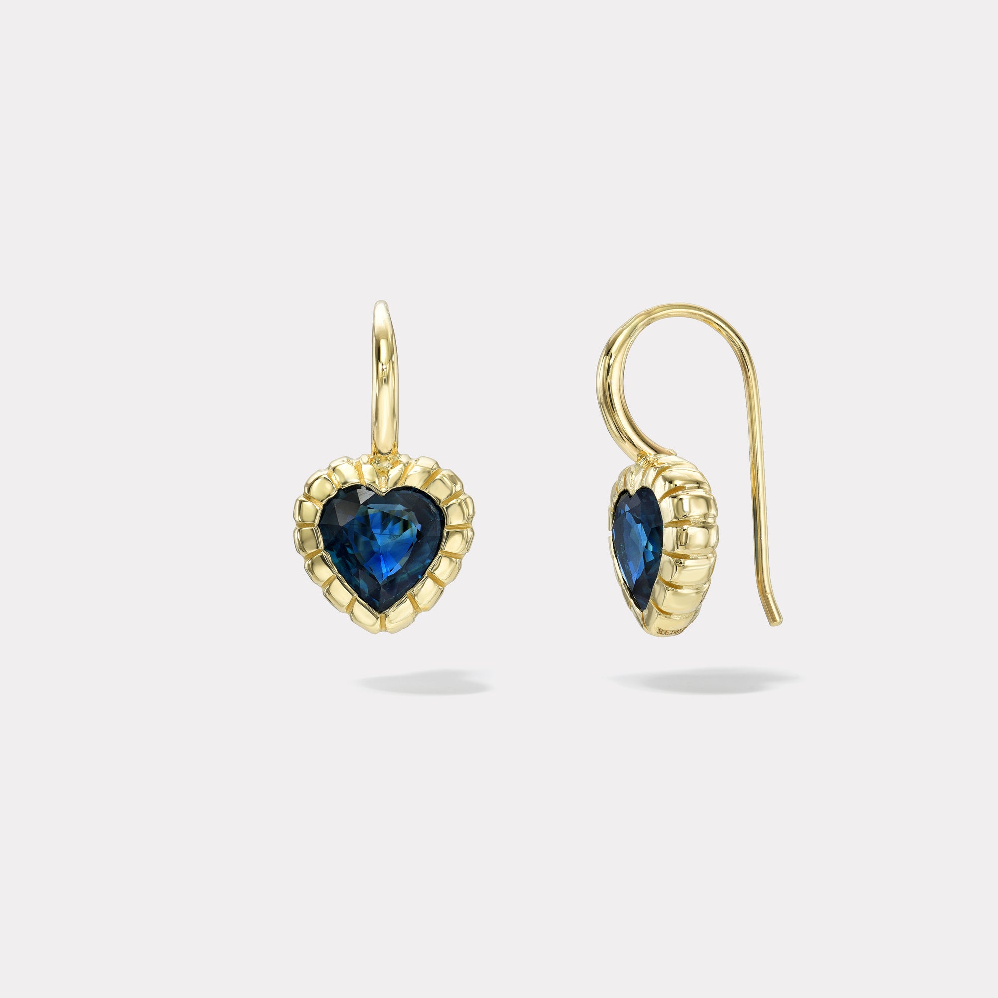 These heart Blue Sapphires are set in our signature Heirloom Bezels. These earrings are solid 14k yellow gold and sit close to the ear. Total carat weight is 2.7ct.