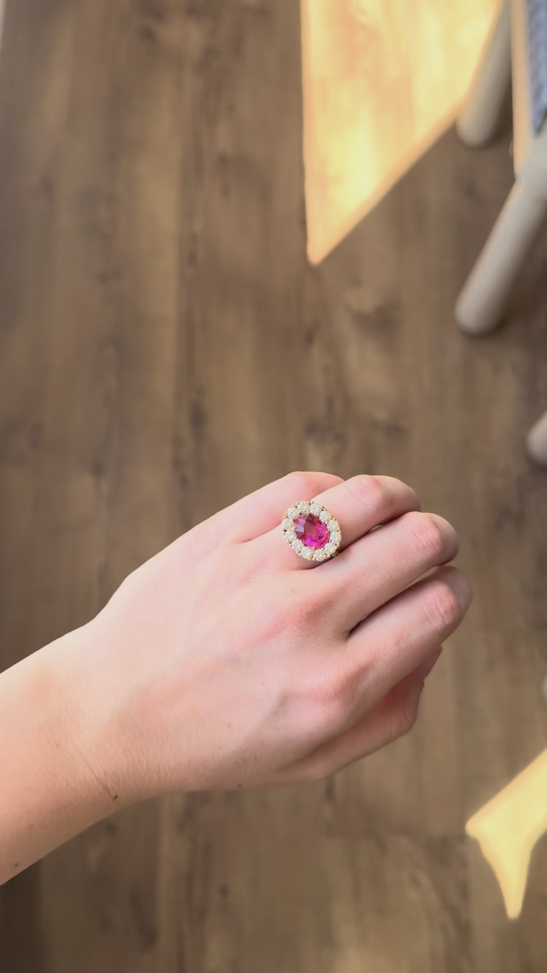 Ring crafted in 18k yellow gold with a stunning 3.62ct Oval Rubellite center with 1.92ct white round brilliant Diamond halo.