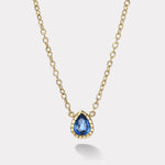 One of a kind pendant featuring a 3.95ct Pear Blue Sapphire on an 18" solid 14k yellow gold handmade chain. Additional jump ring at 16".