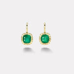 These cushion Emeralds are set in our signature Heirloom Bezels. These earrings are solid 14k yellow gold and sit close to the ear. Total carat weight is 3.9cts.