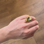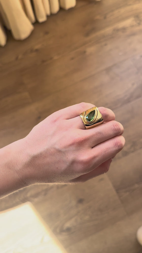 Heavy polished 14k yellow gold with a 3.9ct Pear Green Tourmaline. This ring is a size 7.