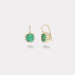 These 4.19ct cushion cut Emeralds are set in our signature Heirloom Bezels. These earrings are 14k yellow gold and sit snug below the ear lobe. Available as a pair only.