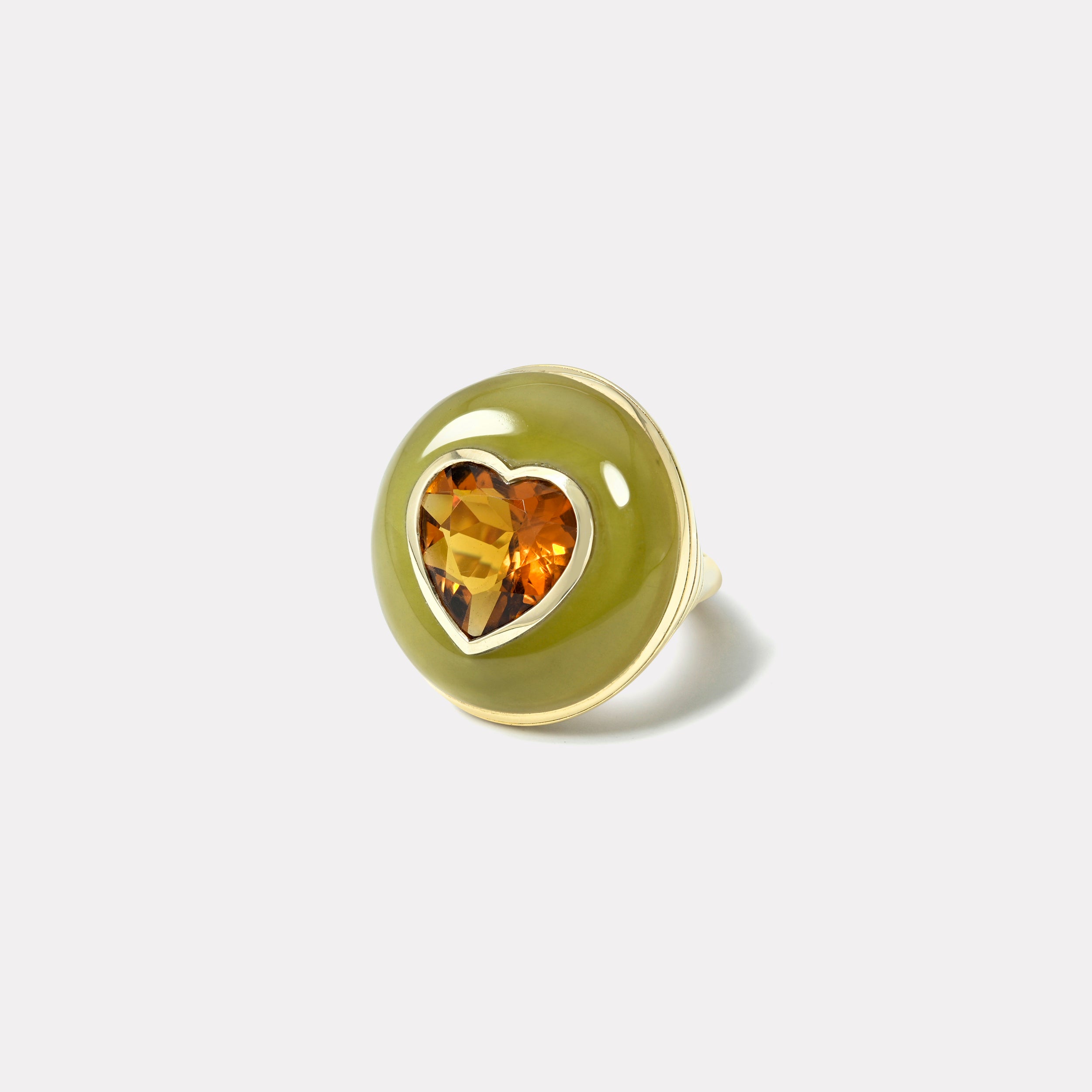 This 14k yellow gold ring features a 4.77ct Heart Citrine in Hand Carved Yellow Beryl.