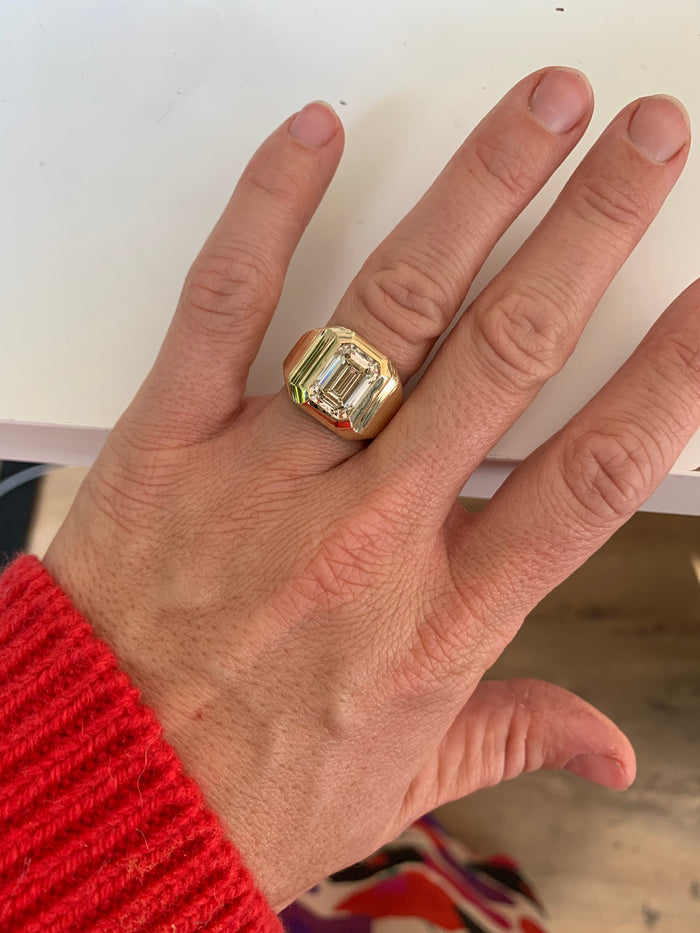 A stunning one of a kind GIA certified 5.06ct Emerald cut Diamond set in 18k yellow gold.