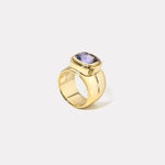 Polished 14k yellow gold with a 5.90ct Cushion Tanzanite. Ring is a size 8. It is one of a kind and ready for immediate shipping.