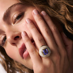8.61ct Square Emerald Cut Tanzanite in Hand Carved Petrified Wood Classic Lollipop Ring