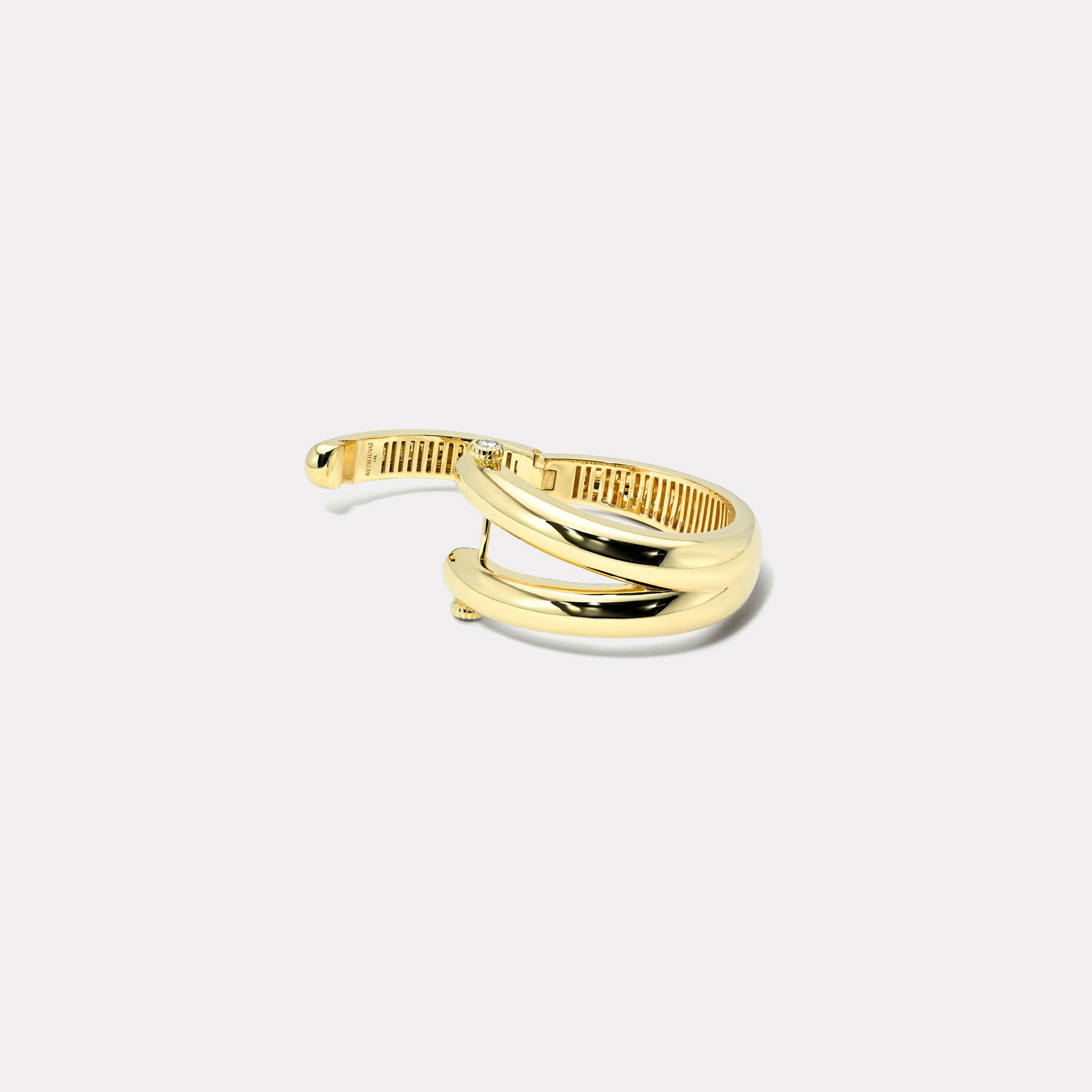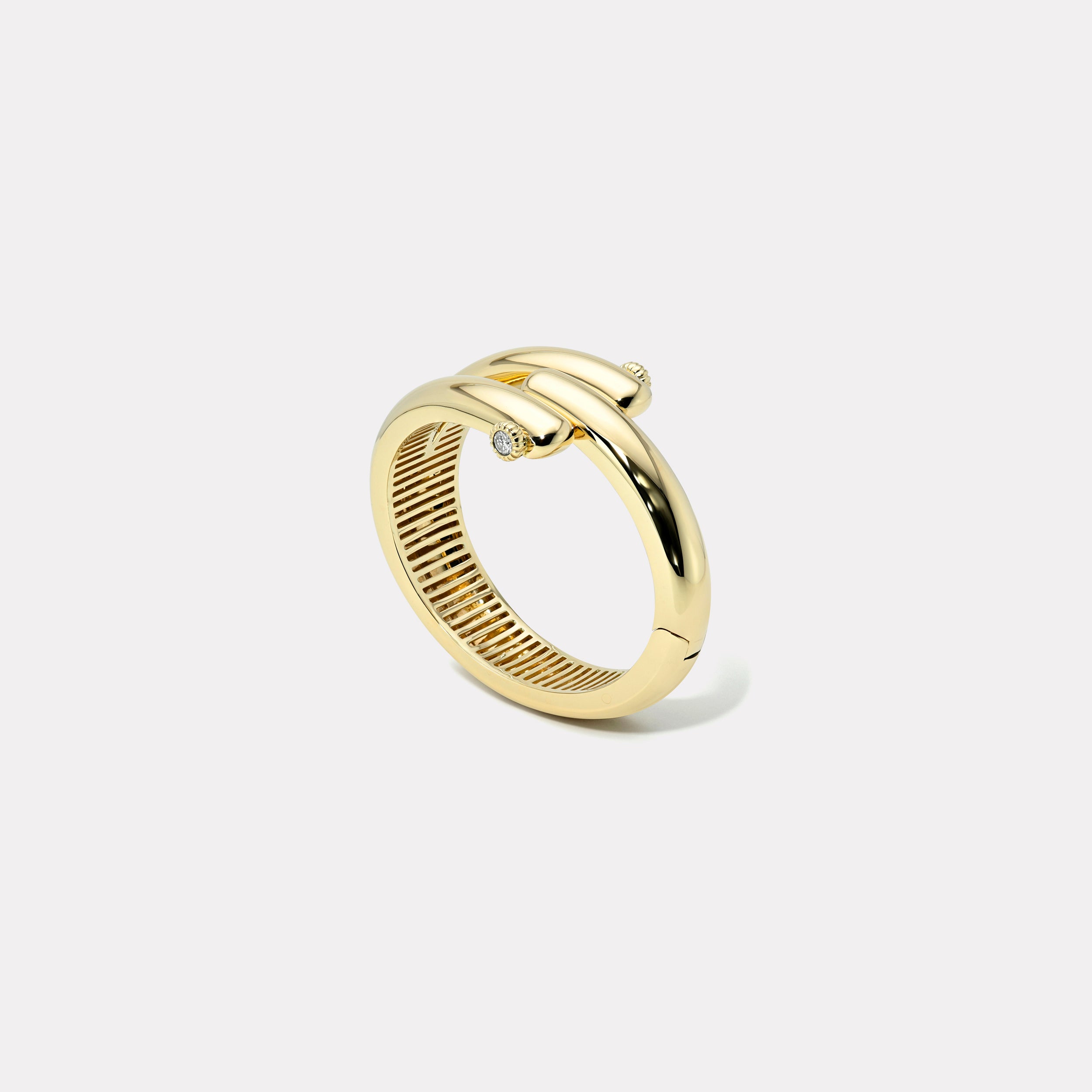 High polished 14k Balloon Magna bangle with 0.48ct Round Brilliant Diamond knobs. Features a latch closure.