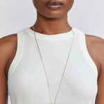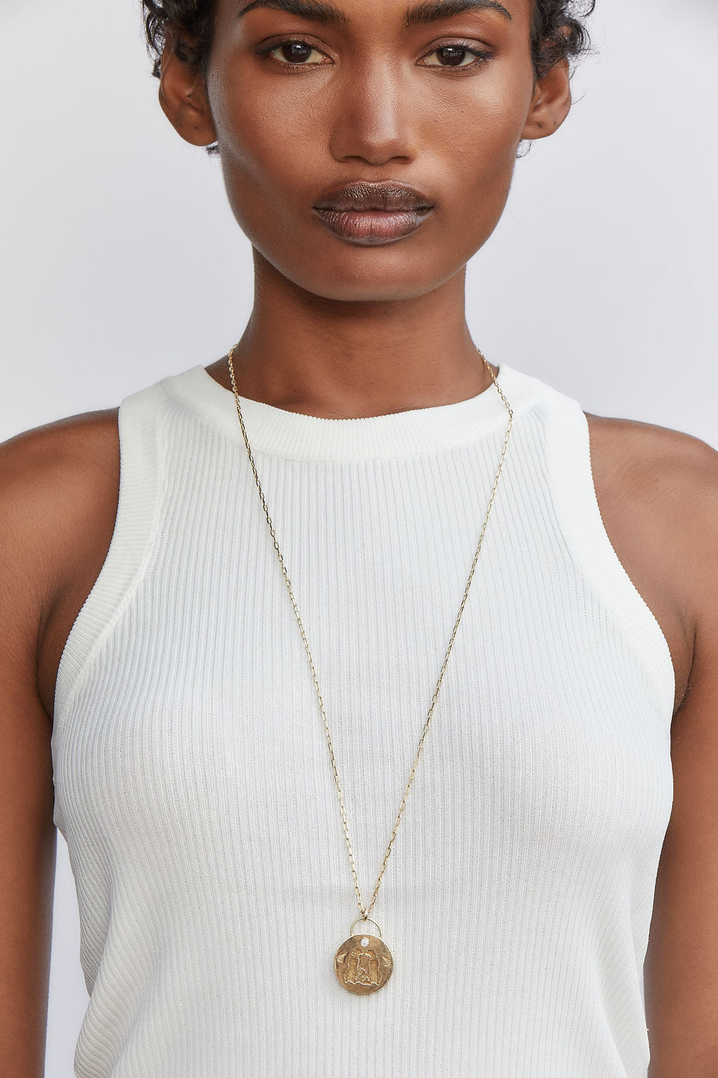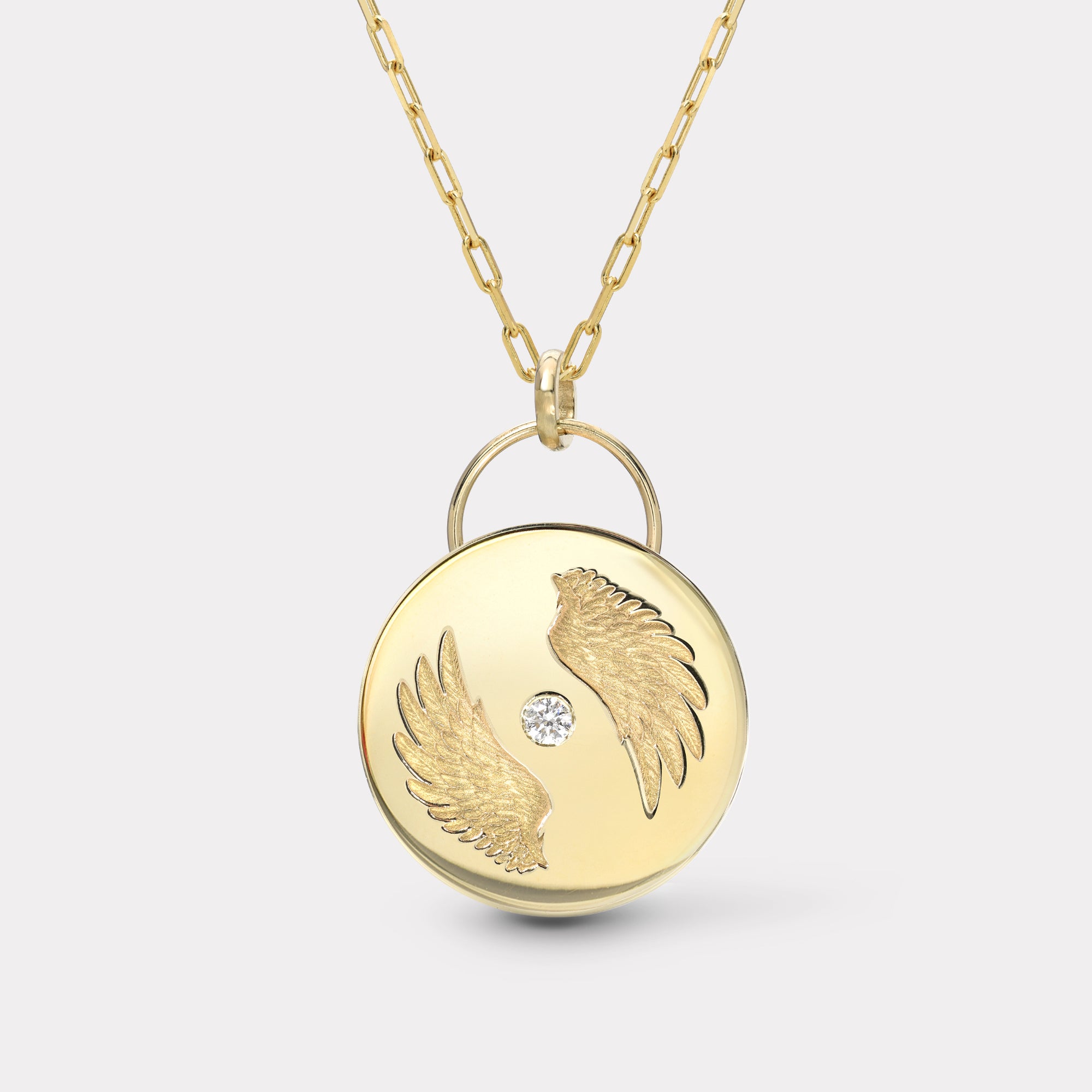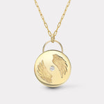 This pieces features a 14k yellow gold padlock medallion with a 0.10ct white round brilliant diamond. Pendant diameter is 24mm. The 30" chain is solid and can be detached from the pendant.