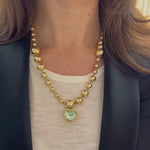 The chain comes standard in 14k yellow gold at 19.5" in length not including gemstone pendant. 12.14ct Mint Tourmaline Heart is fixed in the center of the chain.
