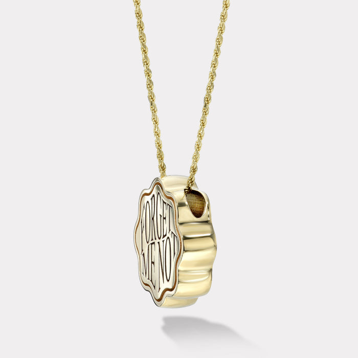 14k yellow gold pendant engraved with the sentiment forget me not.