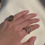 An update on the original Magna ring, this version features larger diamonds for even more impact. Polished 14k yellow gold with channel set French Cut diamonds and two bezel set white round brilliant diamonds.