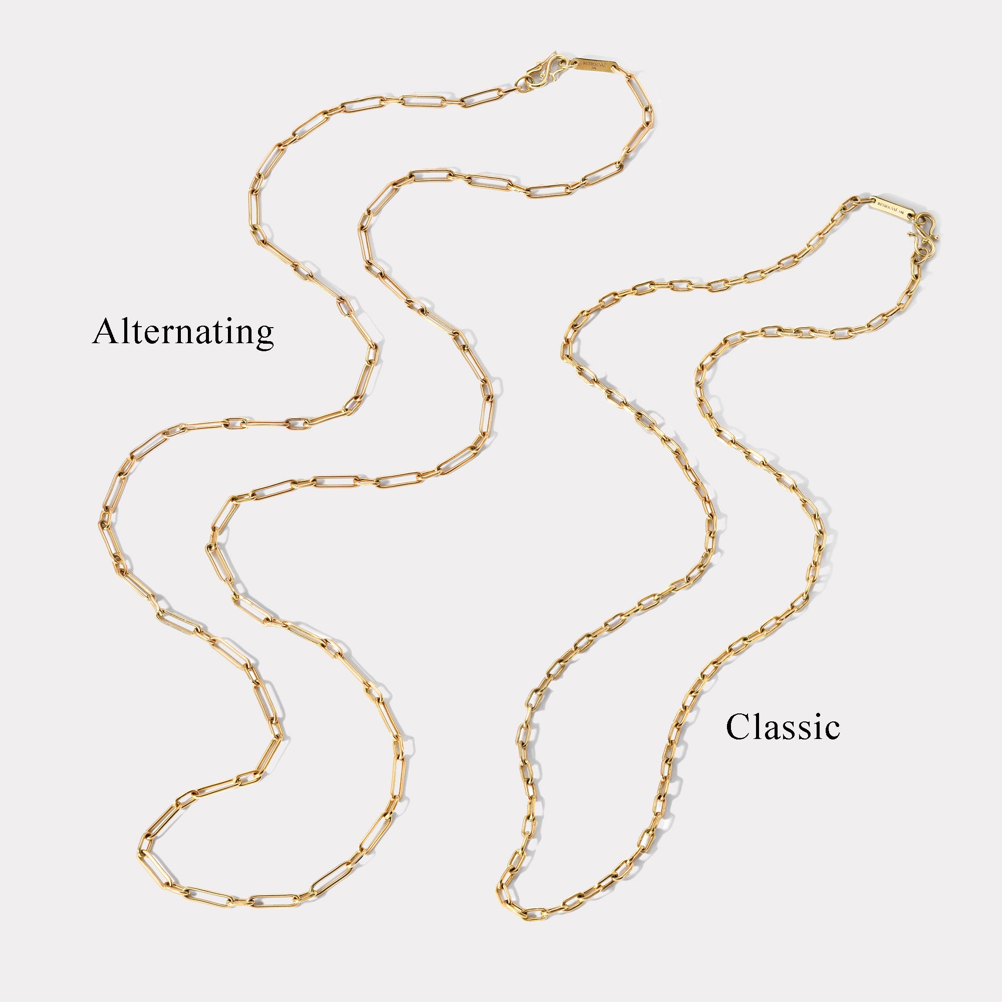Photo on body shows 24" classic link chain and 34" alternating link chain.