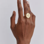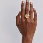 This piece is crafted from solid 14k yellow gold and features a 0.04ct white round brilliant diamond. Face diameter is 20mm.