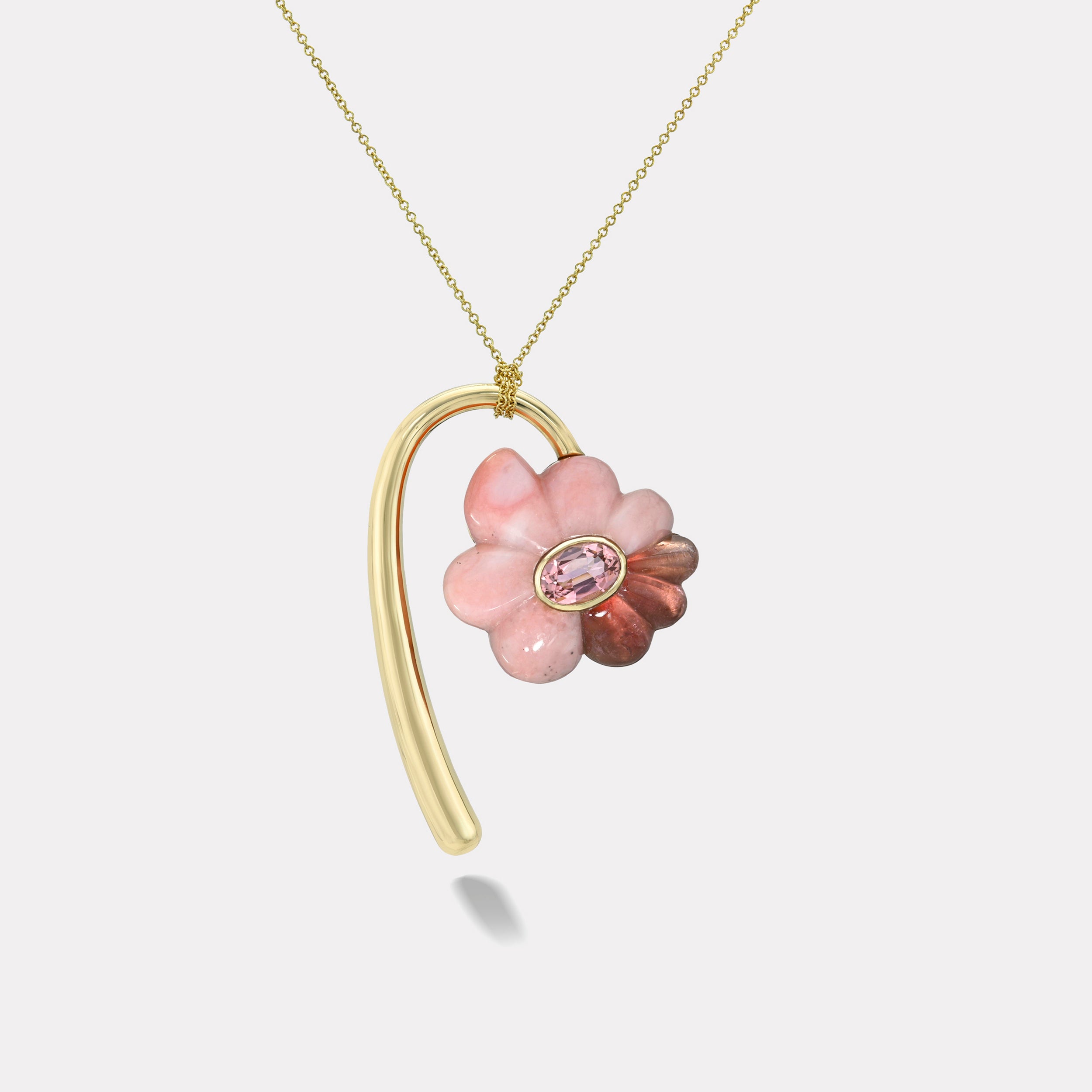 This one of a kind Flora Pendant features a 2.06ct Light Pink Oval Tourmaline in Hand Carved Pink Opal and Pink Tourmaline on a 14k yellow gold rolo 26" chain. Pendant is also 14k yellow gold.