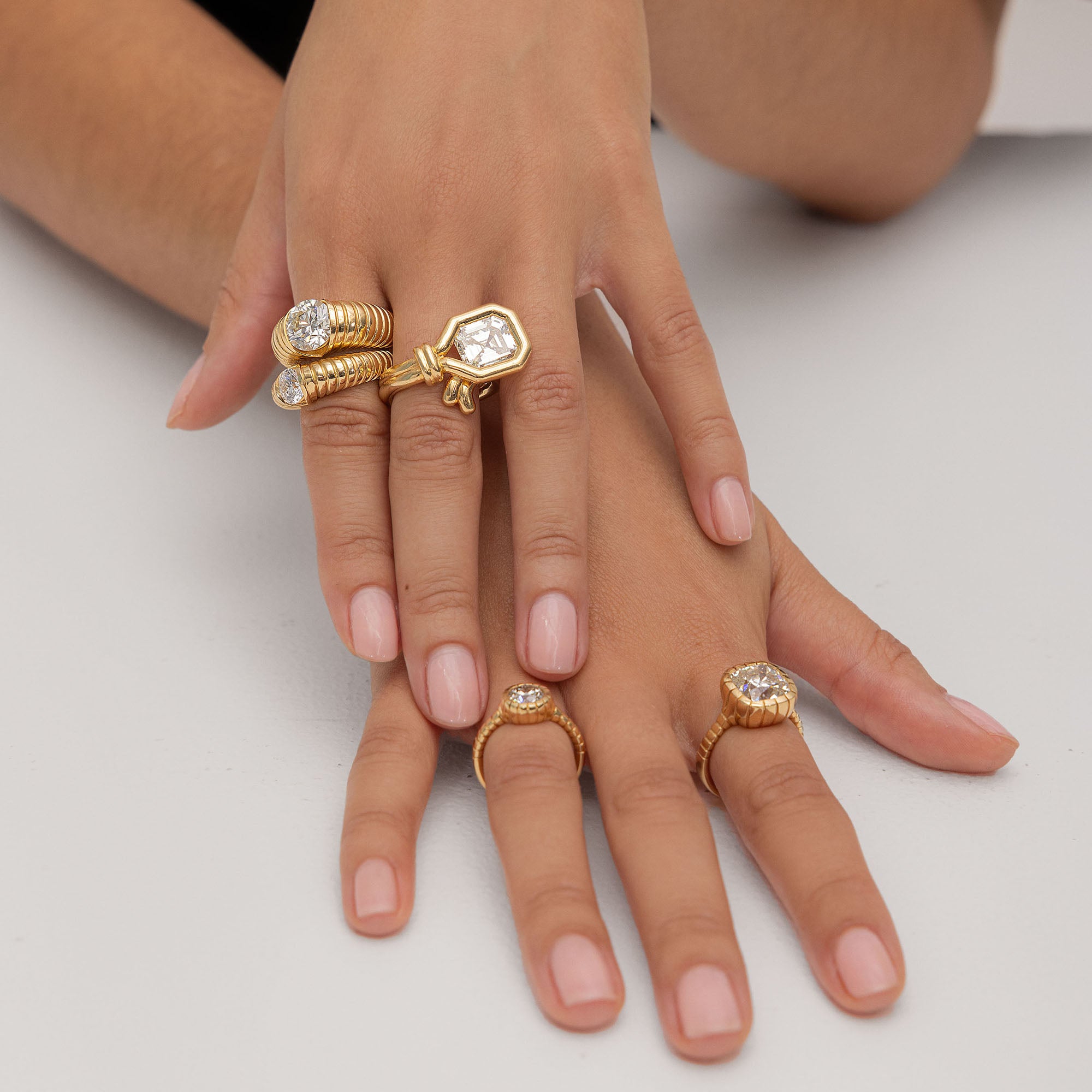 We make jewelry with integrity. The collection is crafted by a small team of skilled artisans who take pride in their work. In the studio, we recycle as much gold as possible. For non-recycled metal, our caster works exclusively with fair trade, fair mined gold. We work with extremely reputable diamond and gemstone dealers both locally and abroad. Our melee (accent diamonds) are conflict-free and consistently sourced from a single supplier. Diamonds with a GIA report are available over 0.25ct upon request. Please inquire for associated costs. Colored stones and the rough stone for our inlay are hand selected. All of our inlay is hand cut in Los Angeles.