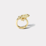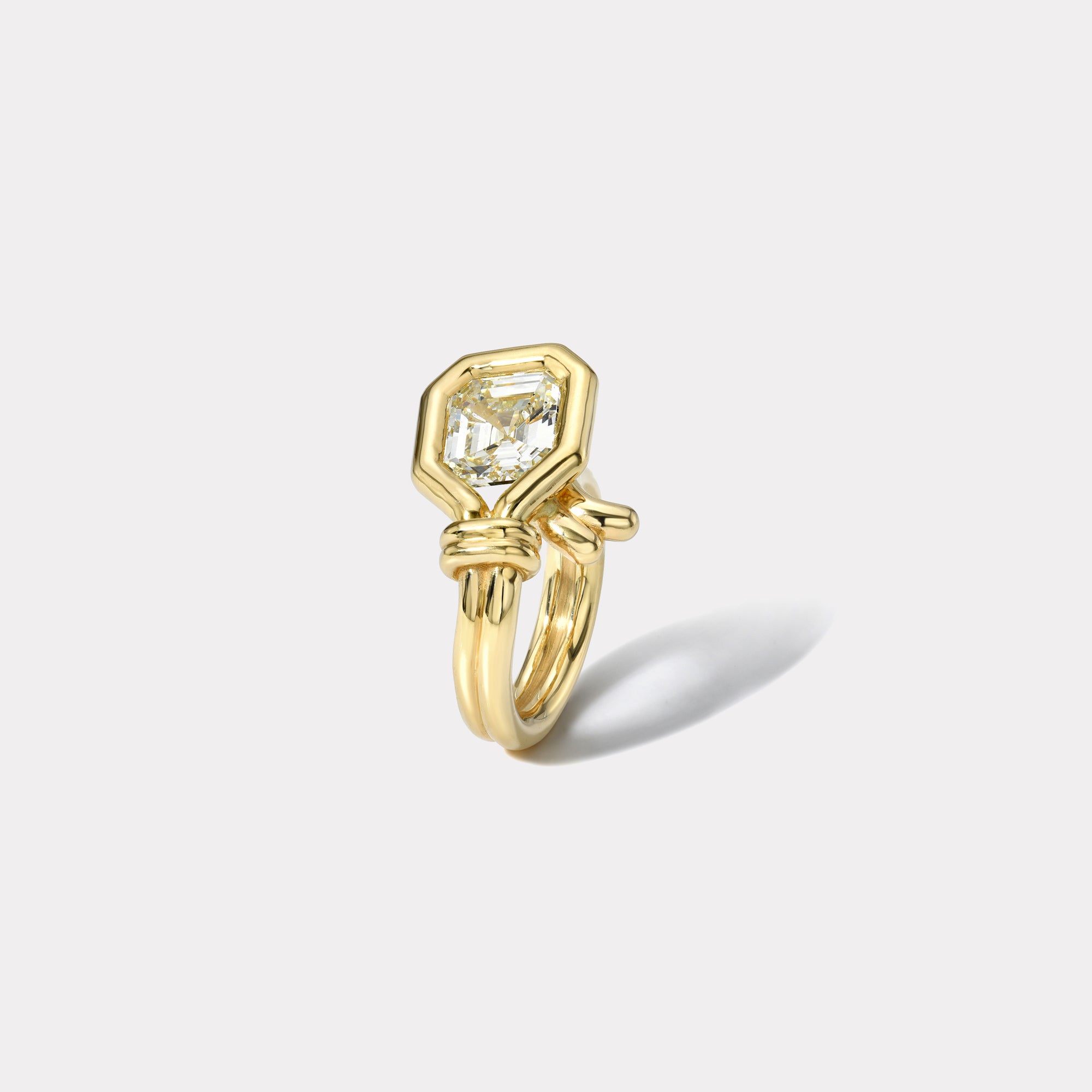 This ring is solid 18k yellow gold and features a 5ct Antique Asscher Cut Diamond. The ring is a size 7.