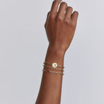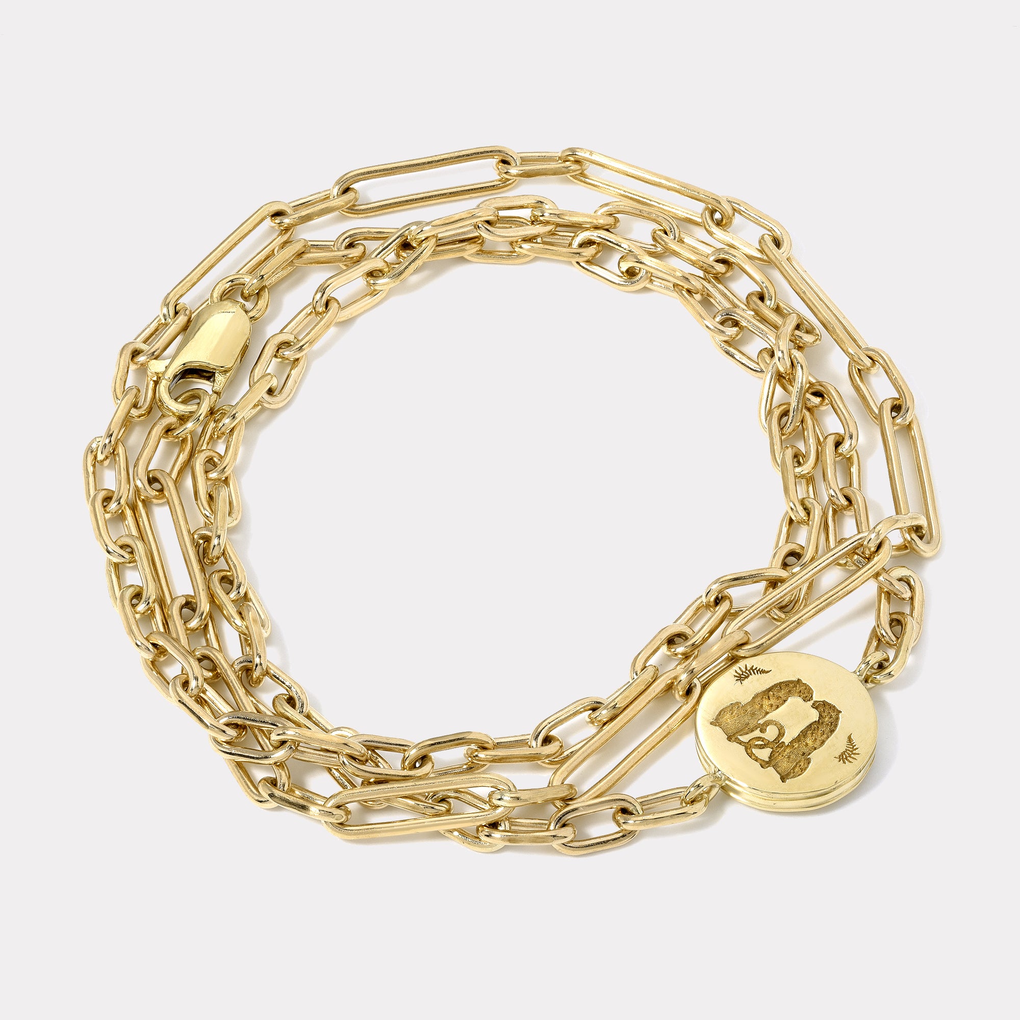 This piece features a 14k yellow gold pendant medallion in a heavy solid gold chain handmade in our studio. Pendant diameter is 12mm. The total chain length is 19.5". Ideal for a 6.5" bracelet size. Please contact us if you're not sure about your sizing.