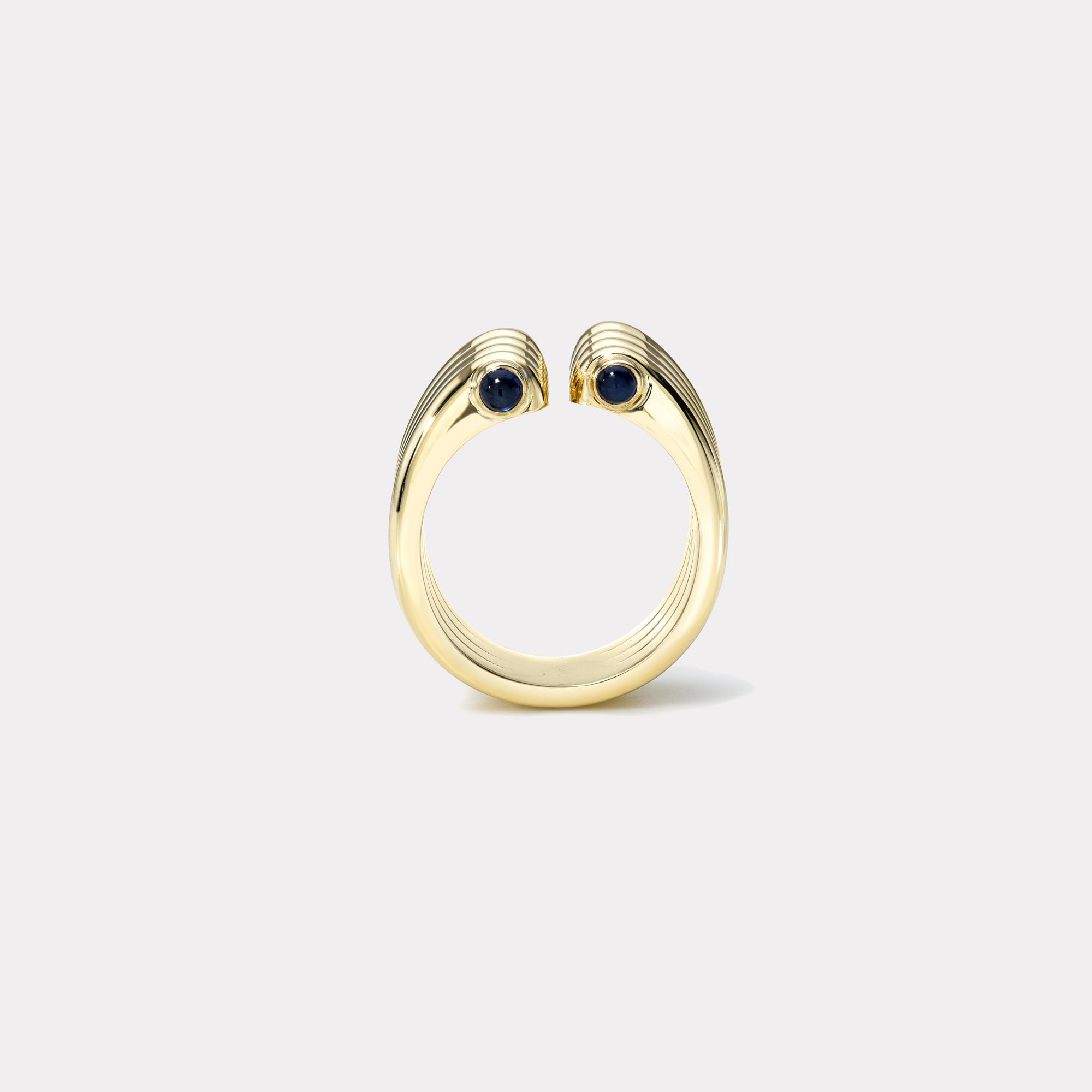 Polished solid 14k yellow gold cuff ring with .4ct blue sapphire cabochons.