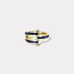The essence of magna is inner strength and connectedness. Interlocking rails of carre cut blue sapphires are accented with white round brilliant diamond knobs.