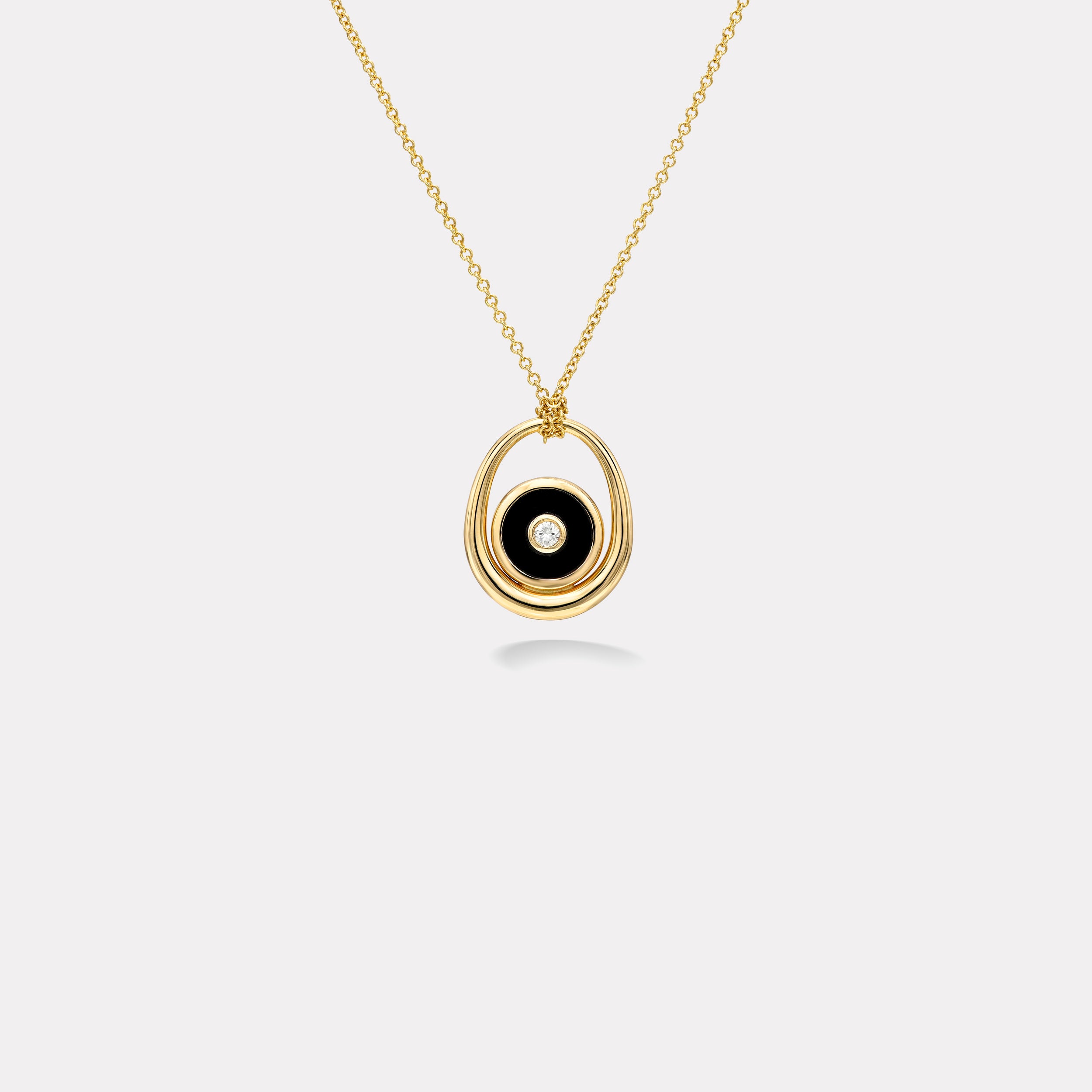 Hand cut Onyx set with a 0.06ct white diamond on a 26" 14k gold rolo chain.