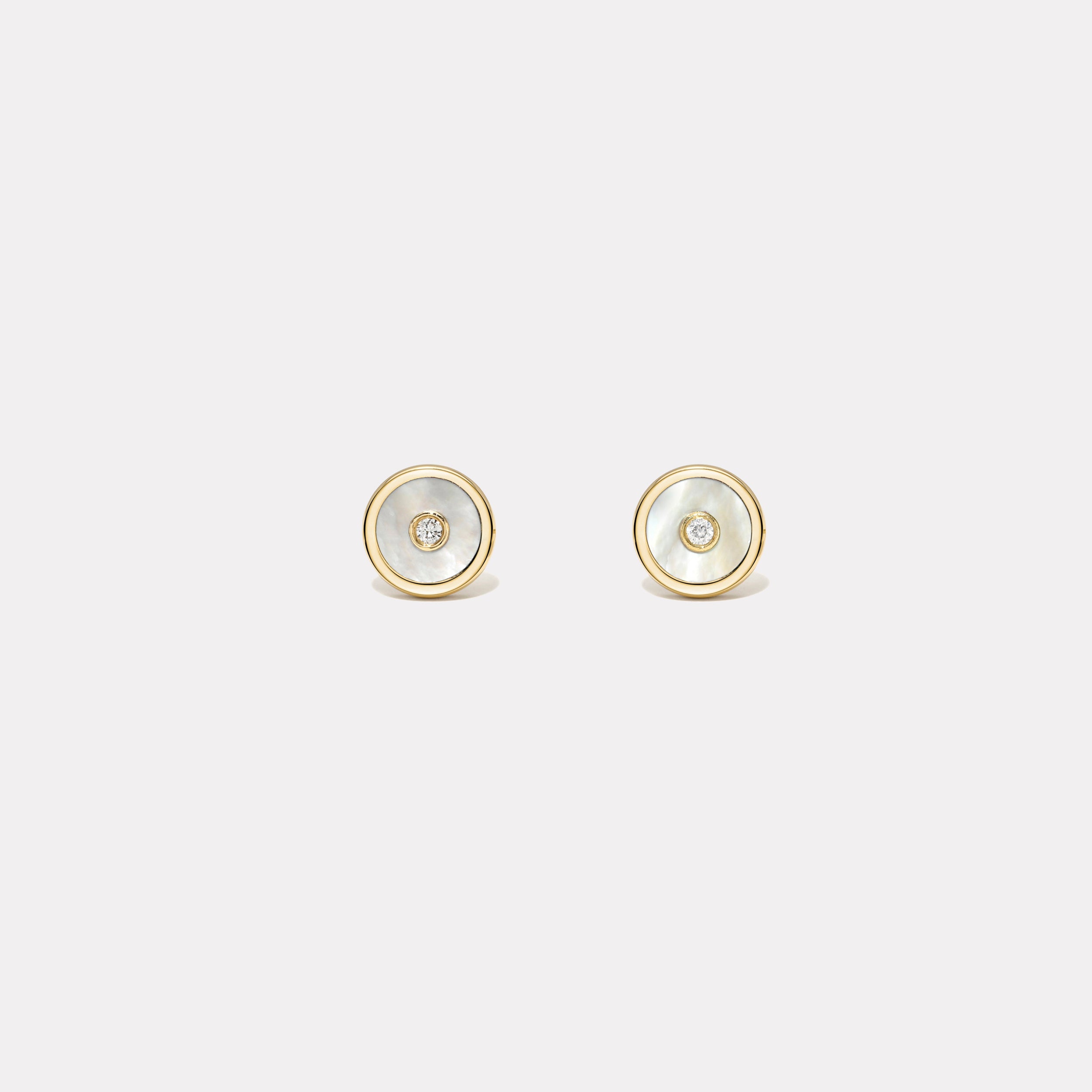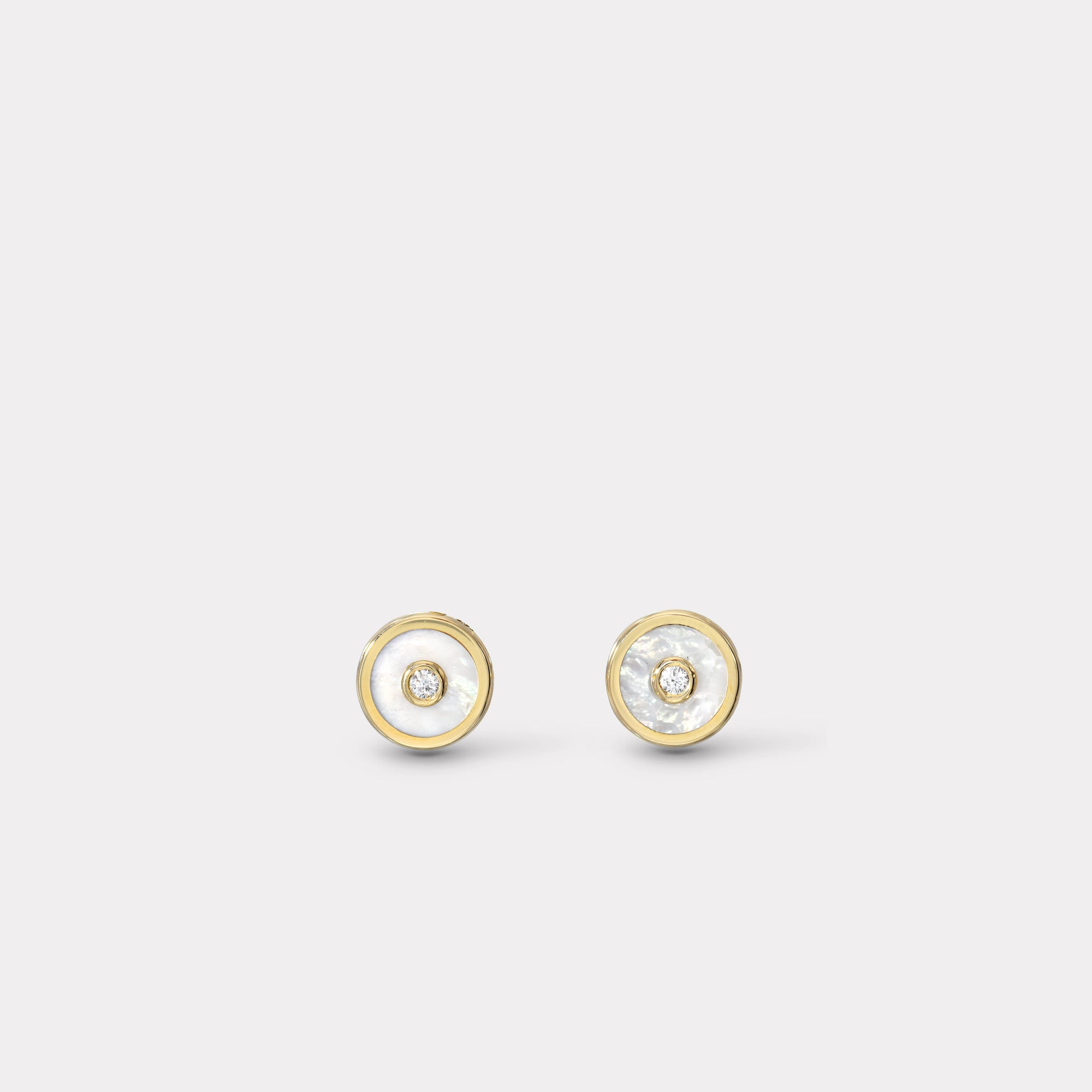 Hand cut Mother of Pearl inlay set in 14k yellow gold with 0.04ct of white diamonds.