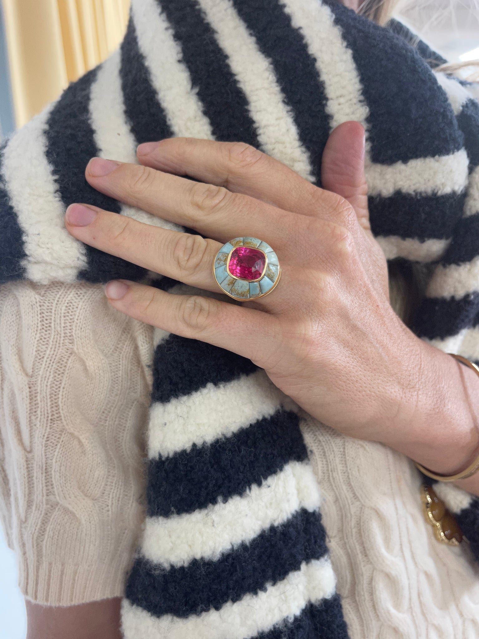 A stunning Lollipop ring is truly one of it's kind. This ring is crafted in 18k yellow gold and features an vivid 8.05ct Mahenge Spinel in hand carved Turquoise.