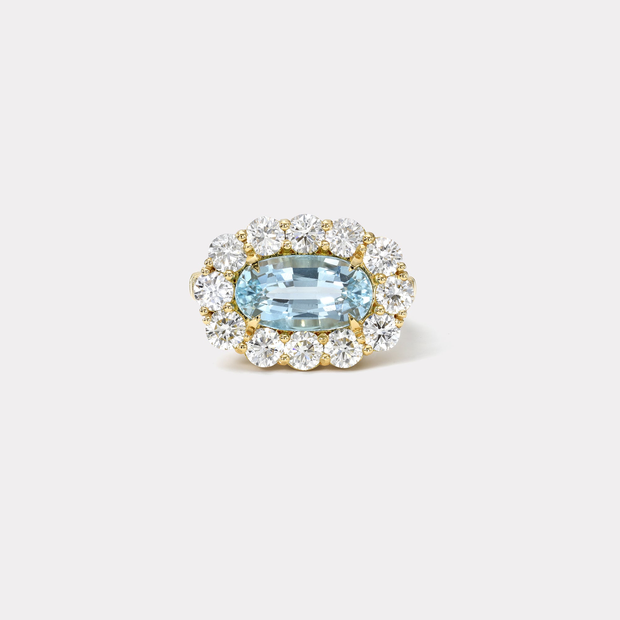 Ring crafted in 18k yellow gold with a 2.8ct E/W Aquamarine with 2.09ct white round brilliant Diamond halo.