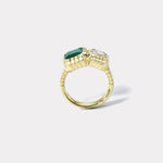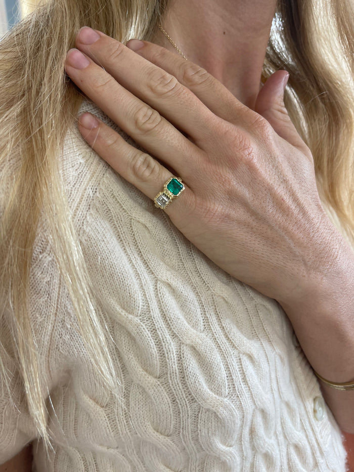 Ring crafted in 14k yellow gold with a 1.17ct GIA J VVS2 Square Emerald cut Diamond & a 1.6ct Emerald.