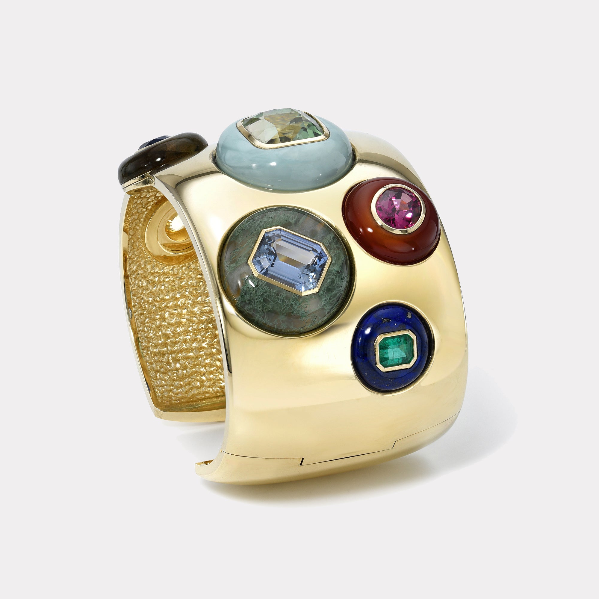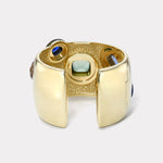 Emerald Cut Emerald in Lapis, Emerald Cut Sapphire in Moss Agate, Oval Pink Tourmaline in Carnelian, Cushion Green Tourmaline in Turquoise, Pear Sapphire in Labradorite, Round Green Tourmaline in Malachite, and Round Yellow Sapphire in Dendrite.