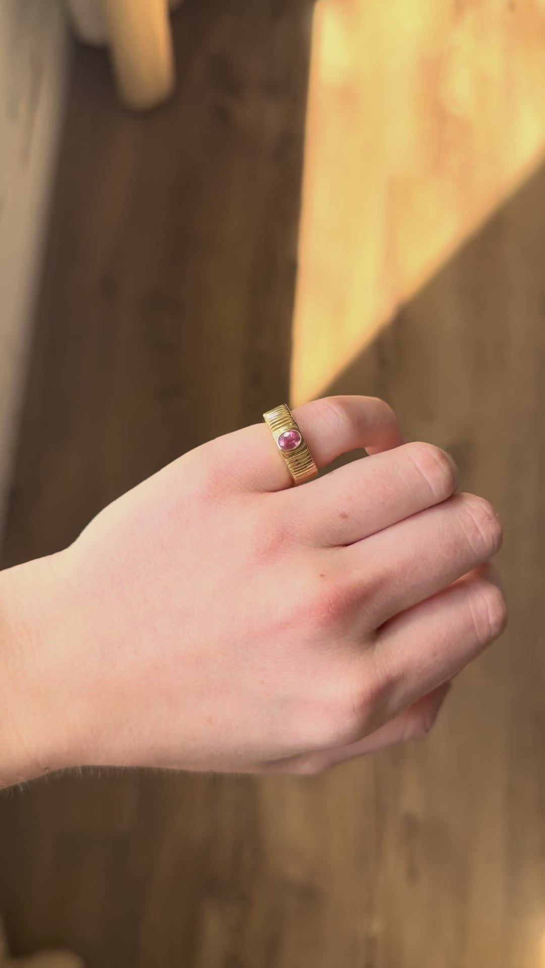 Polished 14k yellow gold with a .80ct Oval Pink Sapphire.