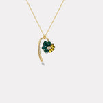 This 14k Yellow Gold Petite Flora Pendant features a 0.14ct Oval Diamond in Hand Carved Dark Green Jade and Green Tourmaline on a 14k yellow gold rolo 26" chain.