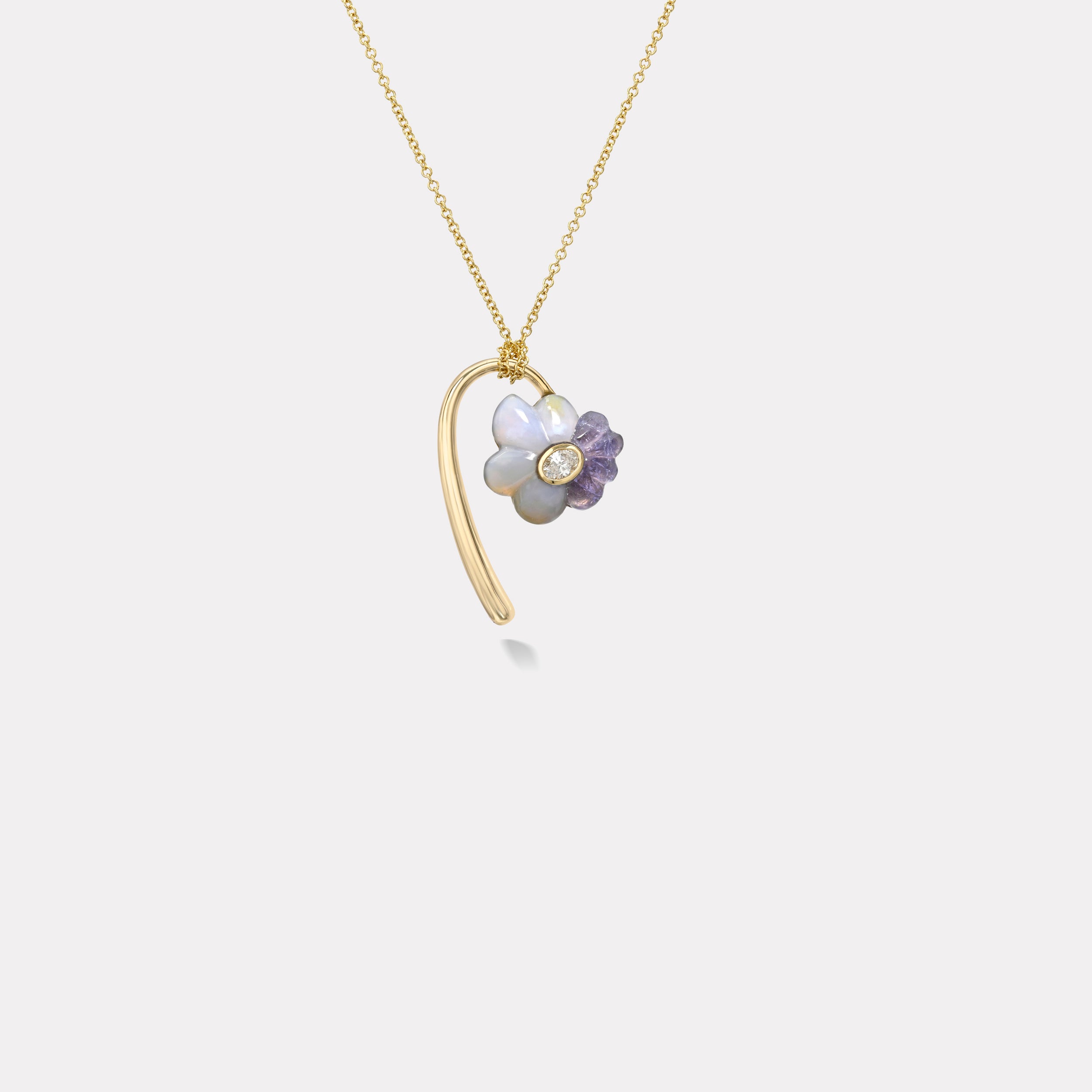 This 14k Yellow Gold Petite Flora Pendant features a 0.14ct Oval Diamond in Hand Carved Chalcedony and Tanzanite on a 14k yellow gold rolo 26" chain.