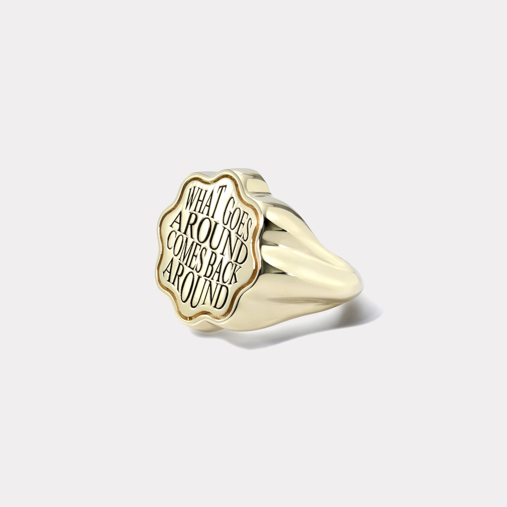 Part of our Talisman collection, this piece embodies karma and is engraved with the sentiment what goes around comes back around.