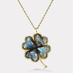 14k lucky talisman four leaf clover with hand cut Labradorite. This pieces comes on a 20" rope chain.