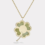 14k lucky talisman four leaf clover with hand cut Pink Opal. This piece comes on a 20" rope chain.