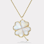 14k lucky talisman four leaf clover with hand cut White Opal. This piece comes on a 20" rope chain.